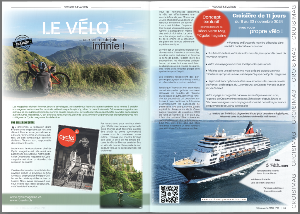 Les magazines doivent innover pour se développer. Nos nombreux lecteurs savent combien nous tenons à enrichir nos pages et notamment les munir de vidéos lorsque le sujet s’y prête. La combinaison de Découverte magazine numérique et nos éditions imprimées comme nous le proposons, ouvre de nouvelles opportunités pour des partenariats avec d’autres magazines. C’est ainsi que nous avons le plaisir de vous annoncer un partenariat exceptionnel avec nos collègues de Cycle ! magazine. La rédaction
