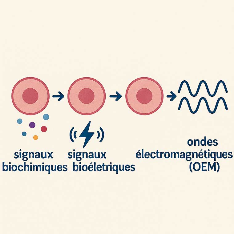 À chaque étape, les cellules communiquent entre elles non seulement grâce à des signaux biochimiques, mais également bioélectriques. Et c’est précisément là que la question des ondes électromagnétiques (OEM) émerge.