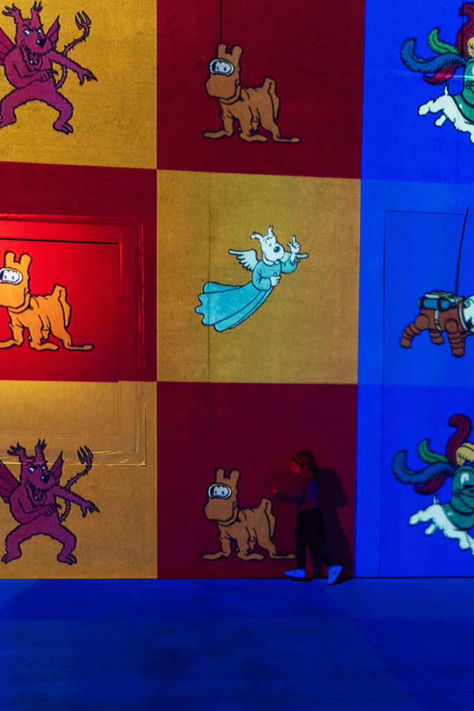 Mais laissez-moi vous raconter la genèse de cette exceptionnelle immersion tintinesque. Après le succès de sa première grande exposition immersive à Lausanne Viva Frida Kahlo, présentée en hiver 2022-2023 – Opus One Expo1 est revenu au Palais de Beaulieu en automne 2023 pour y présenter « Tintin, l’aventure immersive ». Avant d’entrer au cœur de l’aventure immersive, une partie introductive présente quelques-uns des éléments qui composent l’univers de la mythique série de bandes dessinées. La fameuse fusée Tintin, haute de 6 mètres, attend les visiteurs dès l’entrée dans l’espace exposition. Construire une fusée Tintin de cette taille fut une performance ! Brillante de tous ses carrés rouges et blancs, il est certain que cette fusée fera rêver plus d’un visiteur. Rappelons les mots joyeux du professeur Tournesol : « Ah ! mes amis !… Quelle aventure !… Quelle aventure ! ». N’oublions pas non plus de mentionner la bande sonore très réussie et entièrement élaborée par Start Rec, agence de création sonore2.