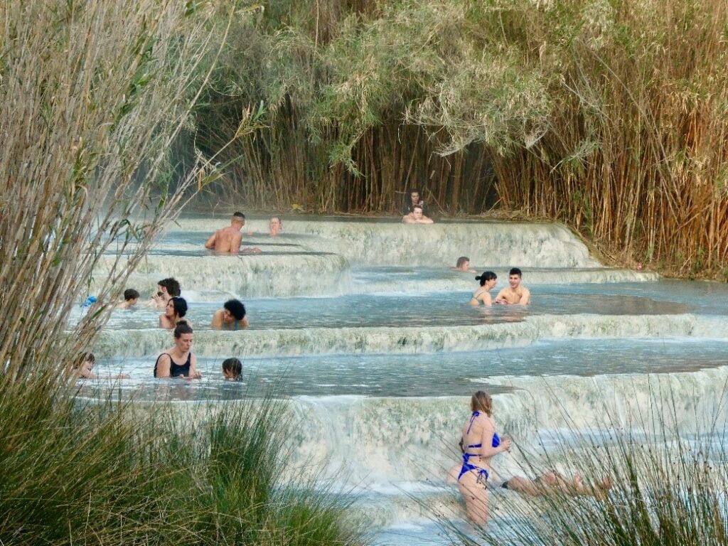 Sorano est perché sur une falaise de tuf et se distingue par son château Orsini et les ruines d’une ancienne forteresse. Dans une atmosphère paisible et authentique, le territoire de Manciano est connu pour ses sources thermales, qui attirent de nombreux visiteurs en quête de détente et de bien-être. Les eaux chaudes sulfureuses de Saturnia sont réputées pour leurs propriétés curatives et sont entourées de paysages magnifiques et il ne faut surtout pas manquer d’aller se baigner vers la cascade naturelle du Moulin de Saturnia où l’eau a formé des petits bassins. C’est extra.