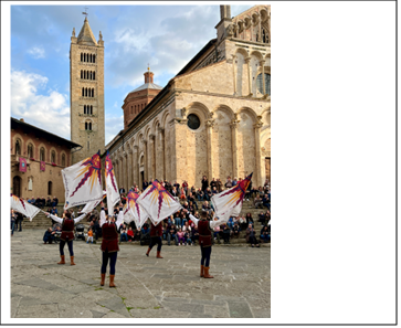 En direction du nord de la Toscane et de Pise, Massa Marittima est aussi une jolie ville médiévale située dans les collines de la Maremme. Perchée à 380 mètres au-dessus du niveau de la mer, elle est connue pour sa magnifique cathédrale romane, sa place principale pittoresque et ses ruelles étroites pleines de charme. Une grande fête s’y est déroulée lorsque j’ai eu le plaisir de visiter cette petite ville. Filles et garçons y lancent le drapeau. Regardez !